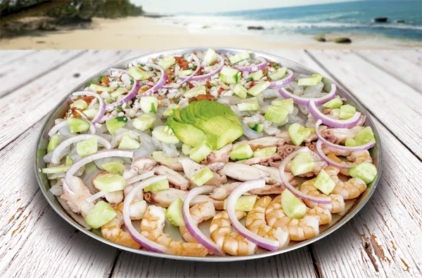 Ceviche de pescado, ceviche de camarón, marlin, camarón cocido o camarón aguachile.