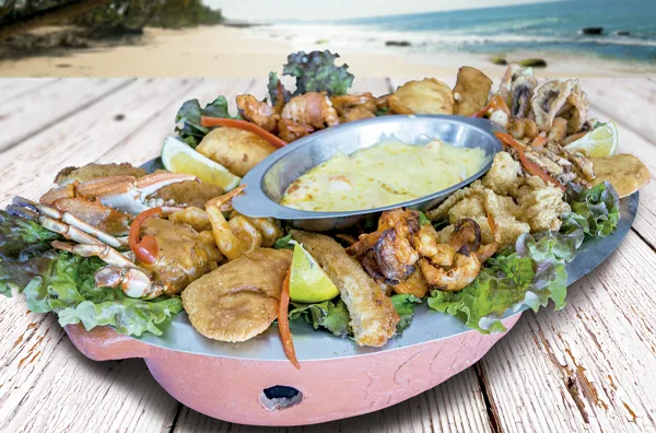Camarón diferentes preparaciones, pescado frito, empanadas, tacos y chicharrón de pescado o de calamar.